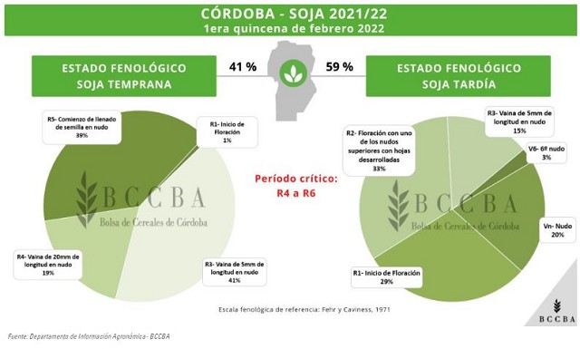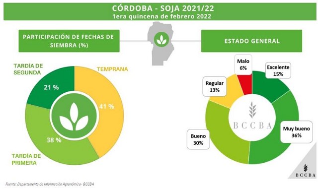 A la fecha de relevamiento, se reportaron condiciones generales en un 80 % entre buenas y excelentes con algo más del 10 % de los lotes ya en madurez fisiológica. La principal causa de los cultivos en estado entre regular y malo fue la saturación de los lotes con el agua de las precitaciones ocurridas durante el mes (anegamiento), con acumuladas de hasta 100 mm, principalmente al sureste en los departamentos Juárez Celman y Presidente Roque Sáenz Peña.