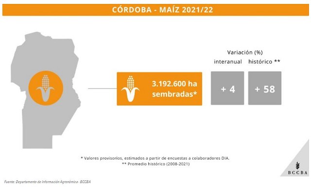 Con la totalidad de las casi 3,2 millones de hectáreas de maíz que se estiman para la provincia ya sembradas, la campaña marca un aumento en su superficie respecto a la pasada y al promedio histórico (2008-2021).
