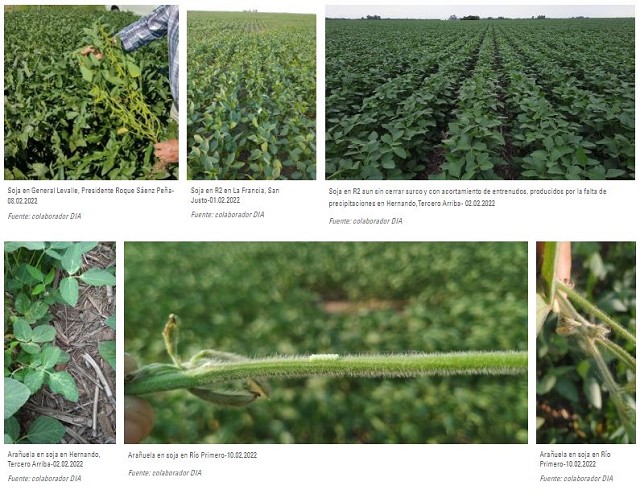 Respecto a plagas y enfermedades, se mencionó la presencia de arañuela (Tetranychus urticae), oruga bolillera (Helicoverpa gelotopoeon) y chinche de los cuernos (Dichelops furcatus) en incidencia entre media y alta y en incidencia baja mancha marrón (Septoria glycines).