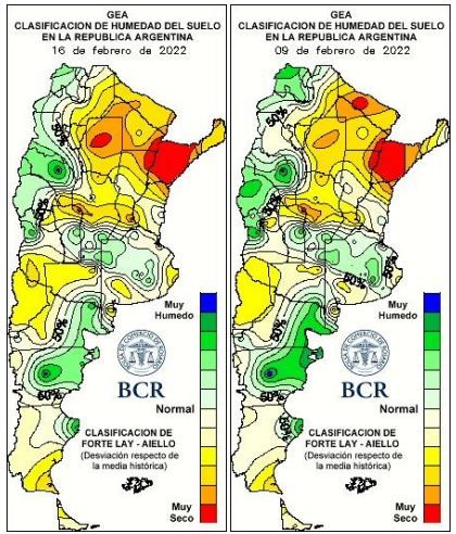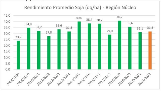 El año pasado a esta altura de febrero (11/2/2021) se estimaba para la oleaginosa 38,5 qq/ha, pero el final de febrero fue seco y cayó 7,4 qq/ha, terminando en 31,1 qq/ha de promedio. Ahora se estima 31,8 qq/ha para la soja de la región núcleo 2021/22, pero ese número no fue ajustado en los últimos 7 días, esperando lluvias importantes que detengan la caída. Pero no han aparecido.