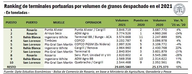 Tornando la atención a las terminales portuarias que mayor volumen de granos despacharon en 2021, las dos que más cantidad de granos embarcaron fueron terminales ubicadas en Rosario: el muelle de Punta Alvear que opera Cargill con 3,85 Mt y el muelle de Arroyo Seco que opera ADM con 3,77 Mt. Además, estas dos terminales intercambiaron su posición en el ranking del año previo. En tercer lugar se ubicó la Terminal Bahía Blanca operada por Bunge/ACA, que incrementó un 59% sus despachos en 2021 y escaló desde la 11va posición alcanzada el año anterior.