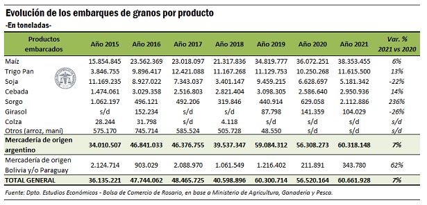 Asimismo, a las 60,32 Mt de granos argentinos que se embarcaron desde todas las terminales portuarias del país en el último año se le suman las 0,34 Mt de mercadería de origen boliviano y/o paraguayo que también tuvieron como lugar de embarque las terminales portuarias ubicadas en territorio nacional, lo que permite arribar al mencionado récord de 60,66 Mt.