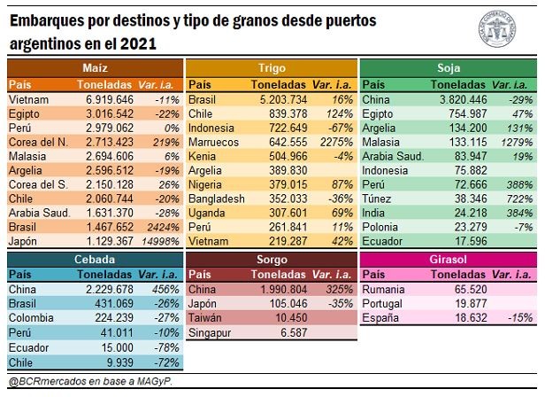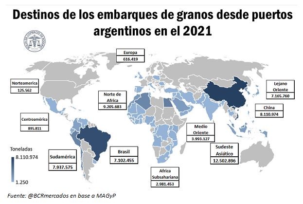 El Norte de África se ubicó segundo con 9,2 Mt (↓3% i.a.) de la mano de los embarques hacia Egipto (3,8 Mt), Argelia (3,1 Mt) y Marruecos (1,7 Mt). En tercer lugar se posicionó China, que recibió 8,1 Mt (↑28% vs. 2020). Luego siguió Sudamérica (sin contar Brasil) con 7,9 Mt (↑6% i.a.) en cuarto lugar. Aquí se destacan los despachos hacia Perú (3,4 Mt) y Chile (2,9 Mt). El Lejano Oriente con 7,2 Mt (↑108% vs. 2020) quedó en quinto lugar con Corea del Norte recibiendo 2,7 Mt, Corea del Sur 2,1 Mt y Japón 1,2 Mt. Por último, el sexto de los principales destinos fue Brasil con 7,1 Mt (↑39% i.a.).