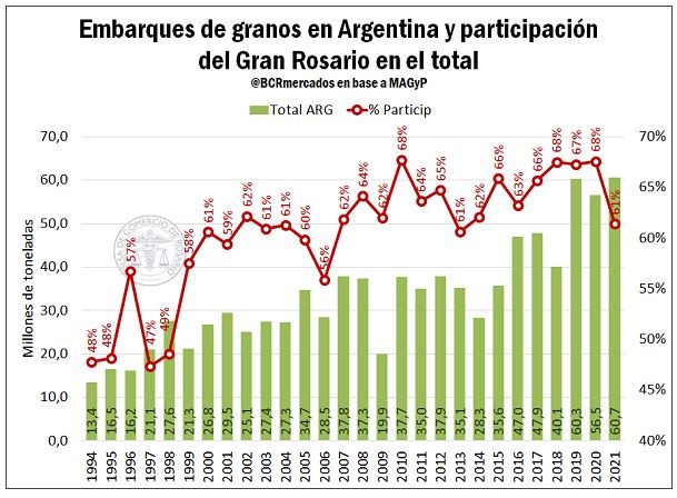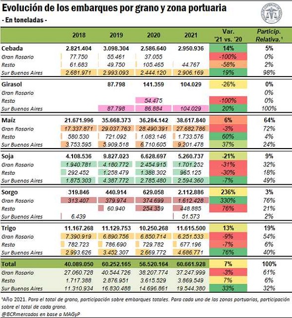 En este contexto, y a pesar de las dificultades que impuso el nivel del Río Paraná y el revés productivo que sufrieron algunos de los principales cultivos durante la última campaña, el país despachó, desde todas sus terminales portuarias, granos por 60,66 Mt en el 2021, un 7% más que todo lo embarcado en 2020 y alcanzando un récord histórico al superar la marca del 2019 (en aquel entonces se despacharon 60,3 Mt).