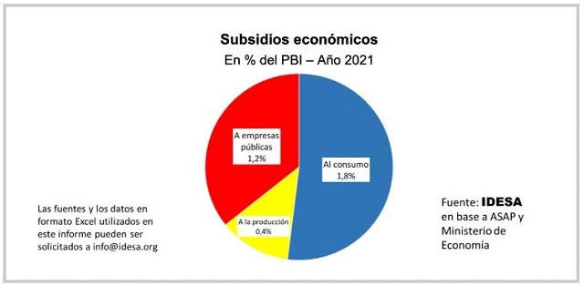 Estos datos muestran que los subsidios económicos tienen una incidencia decisiva sobre las finanzas públicas (representan un 3,4% del PBI, monto similar al déficit primario) y características heterogéneas. Los subsidios al consumo son los que se destinan a las tarifas de electricidad, gas y transporte urbano. Los subsidios a la producción son los que se destinan a las empresas productoras de energía. Los subsidios a las empresas públicas son los que se asignan al pago de salarios y proveedores de empresas estatizadas, como los trenes, Aysa, Aerolíneas Argentinas, Río Turbio, Correo Argentino, o empresas creadas para hacer frente a un desabastecimiento, como la ex – ENARSA (hoy Integración Energética) y otras empresas estatales.