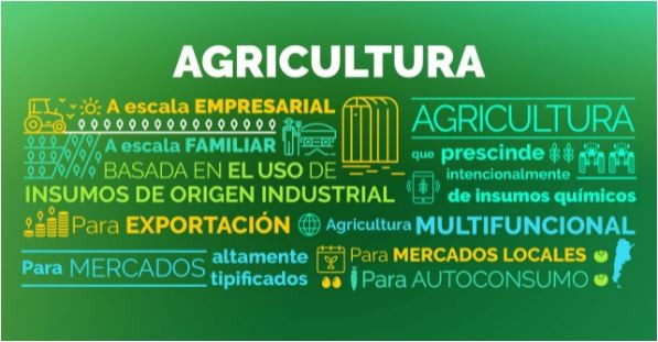 La agricultura puede realizarse tanto a escala empresarial como familiar. La producción puede destinarse a la exportación, a mercados altamente tipificados, mercados locales e incluso al autoconsumo. Además, los distintos tipos de agricultura pueden basarse en el uso de insumos de origen industrial, como fertilizantes y fitosanitarios, o prescindir de ellos intencionalmente. A estos tipos los denominaremos agricultura convencional y orgánica, respectivamente. Hay amplias diferencias entre los tipos de agricultura. Sin embargo, existen muchas otras características compartidas.