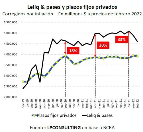 Cabe aclarar que la disminución que se observa en el gráfico en los meses de enero y febrero de Leliq & pases responde a que están medidos en términos reales y febrero todavía no terminó por lo cual habría que esperar a ver qué pasa de aquí a fin de mes.