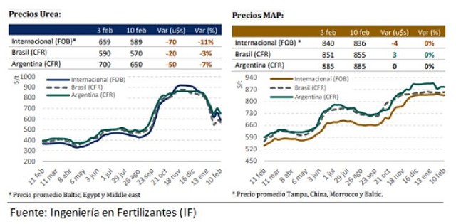 La urea a nivel internacional llegó a valer más de US$ 900/t en diciembre del 2021, con precios apenas por encima de los US$ 300/t en mayo del mismo año. El fosfato monoamónico (MAP) también mostró importantes subas, desde US$ 550/t en mayo a casi US$ 850/t en febrero de este año.