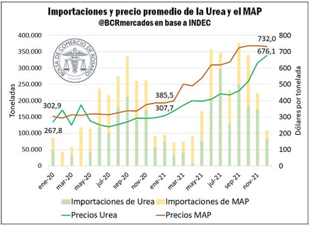 Consecuentemente, los sucesivos cuellos de botella logísticos y productivos del 2021 derivaron en elevadísimos costos de flete y una reacción insuficiente de la oferta respecto al alza de demanda para los fertilizantes. La urea y el fosfato monoamónico (MAP), principales fertilizantes consumidos a nivel mundial, mostraron subas elevadas a lo largo del año pasado.