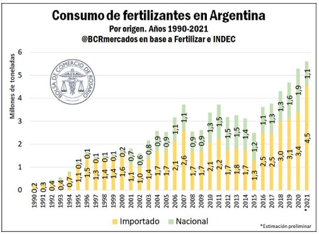 Las crecientes necesidades de fertilización no han podido ser atendidas enteramente por proveedores nacionales. Esto ha redundado en importantes y sostenidas alzas en la importación de fertilizantes. En un marco de elevada siembra, el 2021 cerró como el año de mayor consumo de fertilizantes de la Argentina, con un total en torno a las 5,6 Mt de acuerdo con datos preliminares de Fertilizar AC.