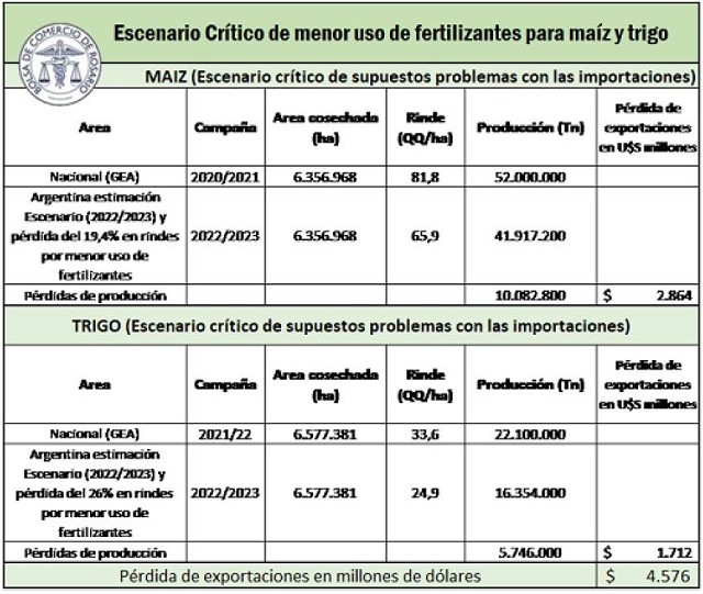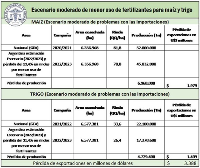Tanto para Trigo, así como para Maíz, se toman los mismos supuestos base, pero se plantea a continuación una caída mayor en los rindes por menor uso de fertilizantes.
