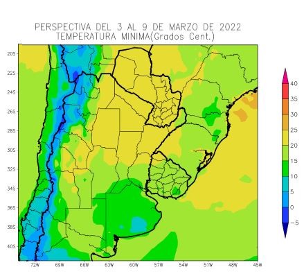 Al comienzo de la perspectiva se mantendrá el ingreso de vientos marinos, iniciado en los días precedentes, provocando un marcado descenso térmico en este del área agrícola, mientras el interior observará registros normales. Los vientos del trópico retornarán rápidamente, provocando temperaturas máximas superiores a lo normal sobre el norte y el centro del área agrícola, mientras que el sur y las áreas costeras continuarán recibiendo vientos marinos que mitigarán los registros. Paralelamente, se producirá el paso lento y un poco irregular de un frente de tormenta con precipitaciones generales de variada intensidad, con sus mayores registros sobre el nordeste y el centro del área agrícola, con riesgo de tormentas severas sobre la Zona Núcleo y el sur del Uruguay.