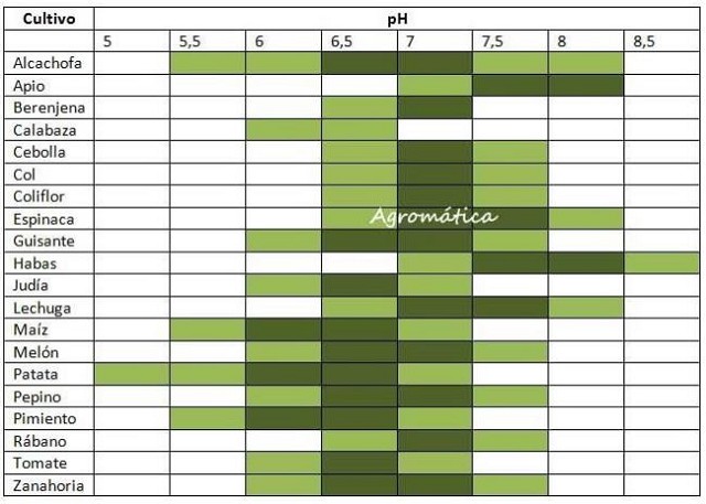 Tabla donde se recoge el pH del suelo en el que se debería mover los principales cultivos