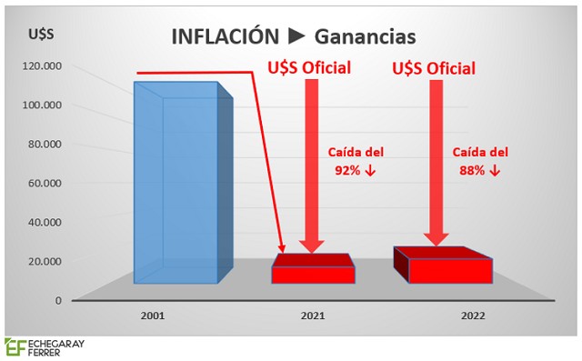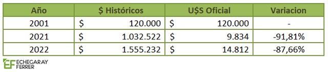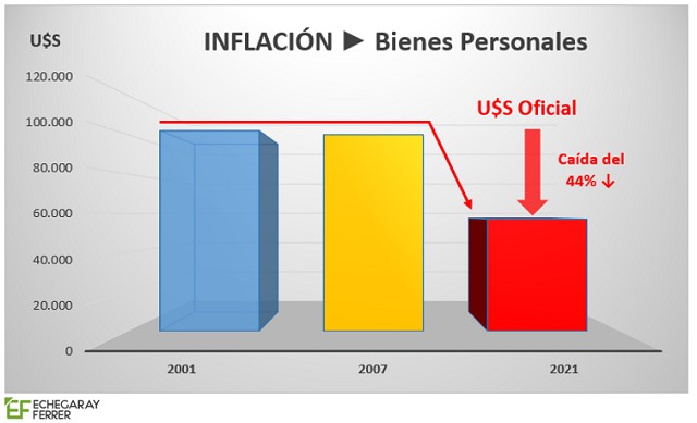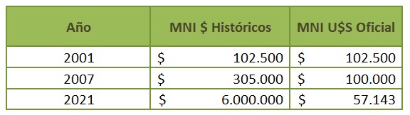 Haciendo otra vez la comparación con 2001, en aquel entonces el Mínimo No Imponible eran U$S 102.000; con el ajuste de 2007, bajó a U$S 100.000; y en el cierre de 2021, se redujo a apenas U$S 57.000, a tipo de cambio oficial, o sea, una caída del 44% en el monto del MNI, que hace que el monto de hace 20 años sea cerca del doble del actual.
