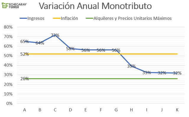 Se actualizan los parámetros en un 26%, con la justificación del ajuste del segundo semestre del 2021, sin considerar lo sucedido con el resto de las categorías y parámetros. En dicho año se actualizaron al 35% todos los parámetros de mera desfasada y retroactiva; esto ocasionó la modificación y la incorporación del “famoso puente”, y junto a esta modificación se incorporó un ajuste en el segundo semestre, solamente del parámetro de los ingresos. En concreto, se ajustaron los ingresos de las categorías como en el caso de “C” en un 36% adicional, mientras que las categorías “I, J y K”, solo un 5%. Ergo, hay categorías que acompañaron la inflación y otras quedaron muy por debajo.