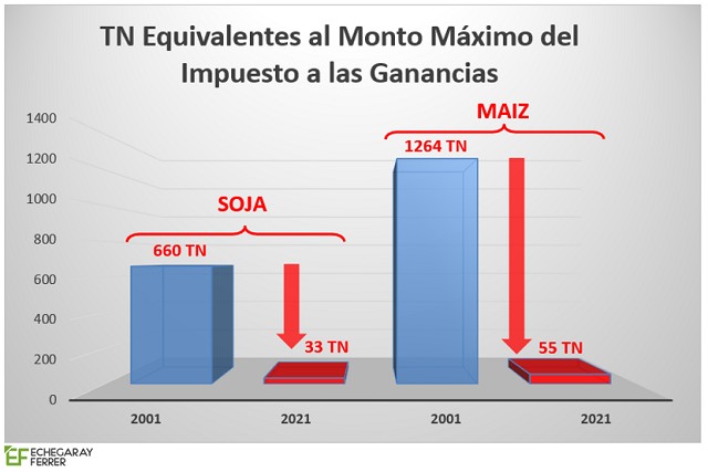 En resumen: La escala del 2001 es 20 veces mayor a la escala actual en soja, y 23 veces en el caso del maíz.