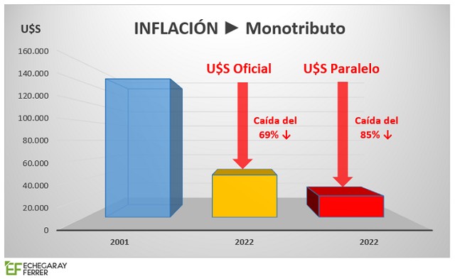 El botón que sobra como muestra: si comparamos el monotributo en la categoría máxima, en 2001 eran U$S 144.000, mientras que en 2022 a tipo de cambio oficial equivale a U$S 44.000. Y cada devaluación, es incluso menos. Estos montos representan una caída del 69% y 85% según el tipo de cambio que se considere, es decir, tenemos una escala que hace 21 años era 3 veces mayor a la actual y 6 veces si lo si consideramos el tipo de cambio paralelo.