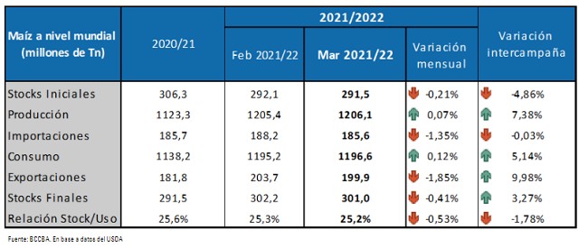 La producción mundial del cereal alcanzaría 1.206,1 millones de toneladas, siendo aumentada respecto a la estimación anterior en 800.000 toneladas. Los stocks finales caerían y serían de 301 millones de toneladas, ubicándose en línea con lo esperado por el mercado.