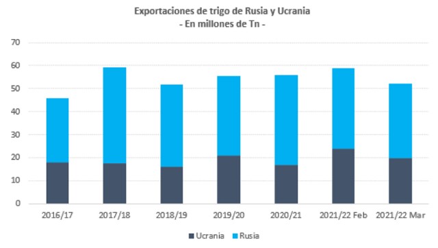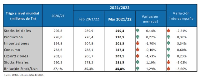La producción global de trigo se estima en 778,5 millones de toneladas, lo cual representa un aumento respecto a la estimación anterior de 2,1 millones de toneladas. Las existencias finales se ubicarían en torno a los 281,5 millones de toneladas, (277,6 millones de toneladas esperado por el mercado), por encima de lo esperado. El incremento en las existencias obedece a mayores stocks en Ucrania y Rusia producto de una caída en las exportaciones de 3 y 4 millones de toneladas respectivamente. La relación stocks/consumo se ubica en el menor nivel de las últimas 5 campañas.