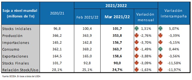 A nivel mundial se estima la producción en 353,8 millones de toneladas, lo cual representa una caída de 10 millones de toneladas respecto a la estimación del mes de febrero por pérdidas productivas en Argentina, Brasil y Paraguay. En cuanto a las existencias mundiales finales, se proyectan en 90 millones de toneladas, cuando el mercado esperaba 89,5 millones de toneladas más.