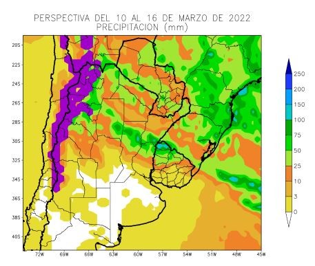 Al comienzo de la perspectiva continuará el paso lento y algo irregular del frente de tormenta, que hizo su entrada en los días precedentes, produciendo varios días con precipitaciones intermitentes, con registros muy abundantes, con riesgo de tormentas severas sobre gran parte del norte y el centro del área agrícola, y registros escasos sobre el sur (donde ya se produjeron precipitaciones abundantes en los días anteriores). Junto con el frente, avanzarán los vientos del sudoeste, provocando un marcado descenso térmico sobre la mayor parte del área agrícola. Posteriormente, retornarán los vientos del trópico, extendiéndose sobre el norte del área agrícola, provocando temperaturas máximas sobre lo normal, mientras el centro y el sur observarán registros más moderados debido a la entrada de vientos marinos.
