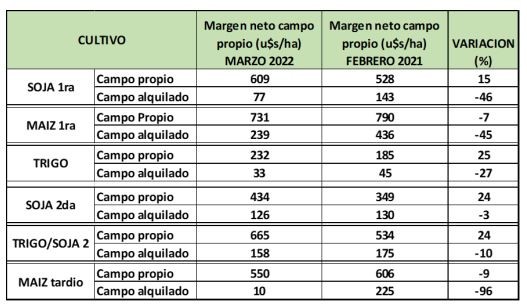 Si comparamos los márgenes netos de febrero 2021 respecto a la proyección realizada el 7 de marzo de 2022 para la campaña 22/23, todos los cultivos bajo condición de campo alquilado presentaron una caída en sus márgenes. El maíz tardío es el que presentó el mayor descuento (-96%). Le siguen la soja de primera y el maíz de primera, con una reducción del 46 y 45% respectivamente. El trigo y el doble cultivo trigo/soja en campo propio fueron los que presentaron la mayor variación positiva en márgenes.