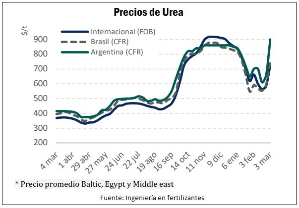Los precios de la urea llegaron a superar los US$ 1.000/tonelada en algunos casos hacia fin de año, prácticamente duplicándose en relación con los precios de principios de 2021. Luego de un marcado descenso en los precios a principios de 2022, el conflicto bélico entre Rusia y Ucrania volvió a incrementar los precios internacionales, dada la importancia de Rusia como proveedor mundial de fertilizantes.