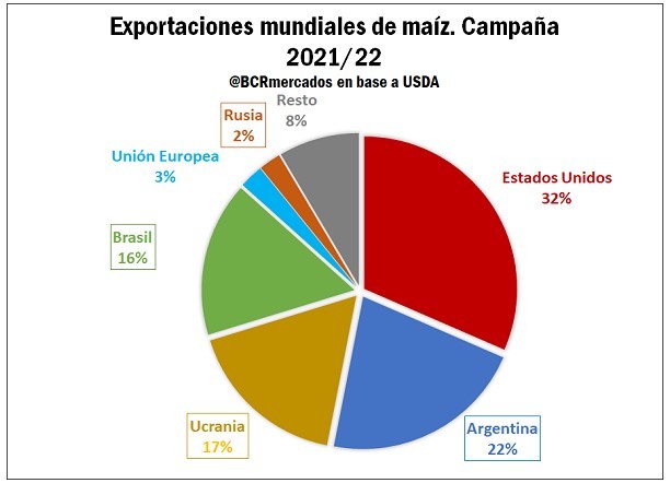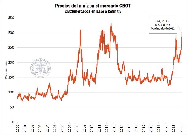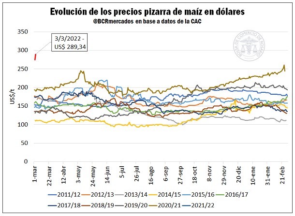 La irrupción de la crisis bélica entre Rusia y Ucrania terminó por catapultar al alza del cereal, que alcanzan máximos desde 2012 en Chicago. Entre Rusia y Ucrania representan cerca del 19% de las exportaciones globales de maíz, y la paralización de la actividad portuaria de las zonas en conflicto (desde donde sale gran parte de los embarques de estos países) estresó fuertemente la cadena de suministros del cereal.