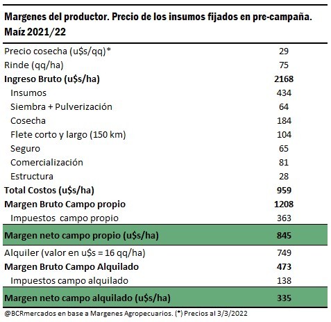 Procederemos a plantear dos escenarios para analizar los márgenes de rentabilidad de un productor promedio de zona núcleo, tomando como base dos momentos distintos de fijación de precio de sus insumos. Por un lado, planteamos una situación en la que los precios de los fertilizantes y demás insumos fueron fijados en la pre-campaña de maíz, allá por el mes de junio (ESCENARIO 1), y otro escenario, quizás más consistente con un productor de menor escala productiva, en que los precios de los insumos son fijados al momento de la siembra, allá por septiembre de 2021 (ESCENARIO 2).