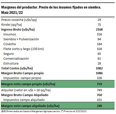 ESCENARIO 1: Suponemos que los precios de insumos fueron fijados en la pre-campaña de maíz. El rendimiento estimado es de 75 quintales/hectárea (promedio zona núcleo). La venta total de la cosecha a un precio promedio de US$ 289/tonelada (Precio CAC al 03/03/2022), es decir, sin coberturas de precio con anterioridad a la cosecha. Se supone paquete tecnológico estándar.