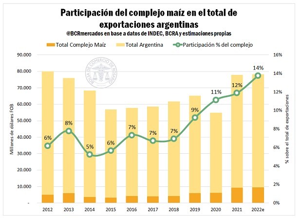 A partir del año 2015, cuando se eliminaron los cupos a la exportación para el cereal, y a pesar del permanente desincentivo de los Derechos de Exportación que gravan sus ventas externas, las exportaciones del cereal no han dejado de crecer. En el año 2021, el valor de las exportaciones de la cadena maicera ascendió a US$ 9.257 millones, representando el 12% de las exportaciones argentinas según datos publicados por el INDEC. Con esto, en una década la cadena duplicó su participación en el valor total exportado por Argentina, pasando del 6% en 2012 al 12% durante el último año.