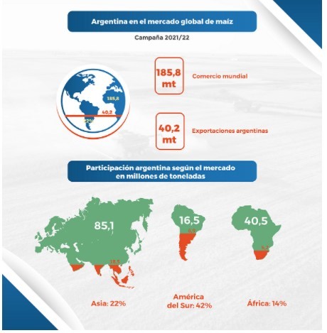 Los principales mercados para el grano amarillo argentino continuarán siendo Asia, América del Sur y África. En 2020/21, Argentina abasteció el 22% de la demanda externa asiática con 18,5 Mt, el 42% de la sudamericana con 6,9 Mt y el 14% de la africana con 5,7 Mt.