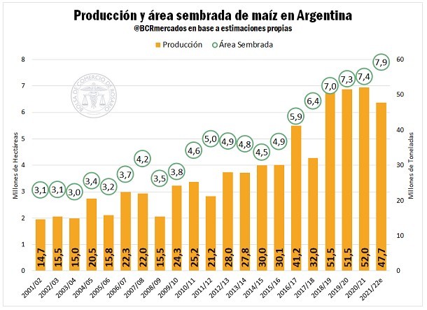 La última primavera, los agricultores argentinos cubrieron 7,9 M ha con maíz, la superficie cultivada más grande que se tiene en registros para el cereal. Lamentablemente, en 2021/22 una nueva sequía coartó el potencial de esta gran apuesta productiva, limitando los rindes de los maíces tempranos inicialmente. A pesar de las condiciones climáticas adversas, se espera una cosecha 2021/22 de 47,7 Mt, que, de materializarse, sería la cuarta mejor en la historia. Dicha estimación conlleva una caída del 8% respecto del resultado 2020/21, equivalente a 4,3 Mt menos.