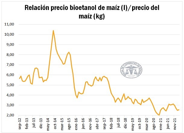 Si se realiza un análisis de largo plazo en la relación del precio del bioetanol a base de maíz y la cotización del cereal, salvo períodos específicos se obtiene una tendencia claramente a la baja en dicho indicador desde el año 2012.