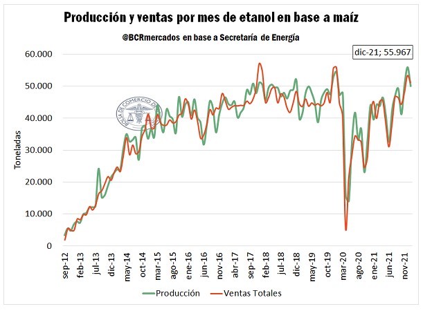En cuanto al bioetanol en base a maíz, la situación evolucionó de manera similar. El total de toneladas producidas durante el último año sumó 522.606 t, registrando un incremento interanual de 26%, mientras que las ventas sumaron 474.128 t, 34% más que en todo 2020. Además, el diciembre último la producción de bioetanol en base a maíz alcanzó un récord histórico, obteniéndose 55.967 toneladas, superando el récord anterior de enero de 2020.