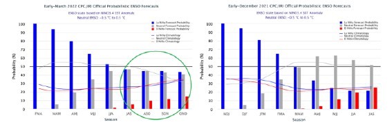 Lo que muestra la última publicación de la NOAA es una muy mala noticia para Argentina: el peor escenario climático empieza a mostrar señales ciertas de que puede volverse realidad. Las publicaciones del organismo internacional que sigue el fenómeno del ENSO muestra que hay un decidido cambio de tendencia en los últimos dos meses respecto de fines del 2021: las barras azules que muestran la probabilidad de valores Niña para junio-agosto pasaron de un 22% (diciembre 2021) a 53% en la reciente actualización de marzo.
