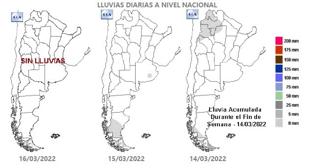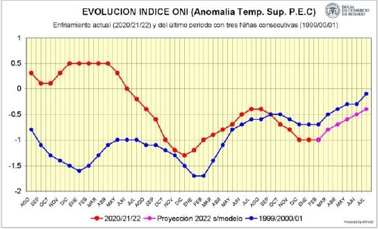 “Según estos datos, las condiciones actuales hacen muy probable que La Niña continúe en el invierno del hemisferio sur. Las temperaturas superficiales del Pacífico por debajo del promedio se fortalecieron durante febrero de 2022 y las anomalías negativas se extendieron desde el Océano Pacífico ecuatorial central hacia el este. El valor de anomalía disminuyó de -0,6ºC a principios de febrero a -1,1ºC en la primera semana de marzo. El sistema acoplado océano-atmósfera está reflejando la continuidad de las condiciones Niña”, explica el consultor Elorriaga. Proyectando los datos actualizados al final de la primera quincena de marzo, hay una razonable posibilidad de que el forzante La Niña continúe en el invierno del hemisferio sur (53 % durante junio/agosto de 2022). A partir de ese momento existe una probabilidad muy pareja (40-50%) de una transición a Niña, que sería la tercera consecutiva.