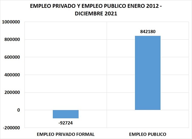 Ese estancamiento se tradujo, de acuerdo a datos del Ministerio de Trabajo, entre enero de 2012 y diciembre 2021, en que el sector privado formal perdió 92.724 puestos de trabajo y el empleo público aumentó en 842.000 puestos de trabajo, principalmente en las provincias, y no se observan mejoras en la educación, la seguridad o la salud que justifiquen ese fenomenal incremento del empleo público.