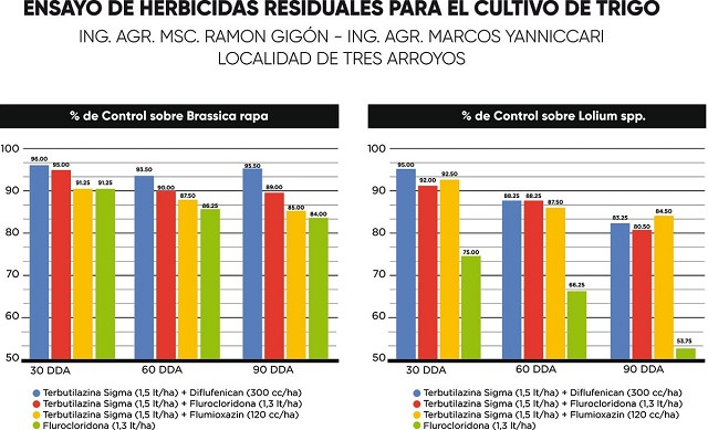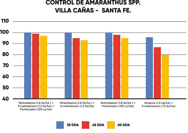 En maíz, la combinación de terbutilazina + flumioxazin (PPO) demostró la más alta tasa de control sobre el Amaranthus (yuyo colorado), gracias a un efecto de sinergismo, efecto de quemado, mayor espectro de control y mayor residualidad. Para un mayor espectro de control, es posible sumarle una cloro acetamida como el S-metolacloro, demostrando un efectivo control tanto en malezas de hoja ancha como de hoja angosta.