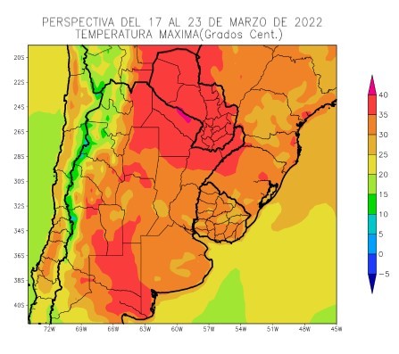El resto del área agrícola registrará temperaturas máximas entre 30 y 35°, con focos de valores menores, y de valores mayores, entre los cuales se destacará una amplia extensión con más de 35°C sobre el sudeste de Cuyo y el sudoeste de la Región Pampeana.