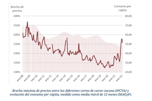 Este reemplazo de oferta proteica se ha dado de manera más marcada en los sectores de menor poder adquisitivo. Pero, a su vez, son estos sectores los que han soportado las mayores subas en el precio de la carne. Si analizamos la brecha de precios entre los cortes más económicos y los más caros, vemos una clara reducción hasta inicios de 2020, momento en el cual el nivel de consumo per cápita comienza a estabilizarse o, al menos, a encontrar cierta resistencia a la baja.