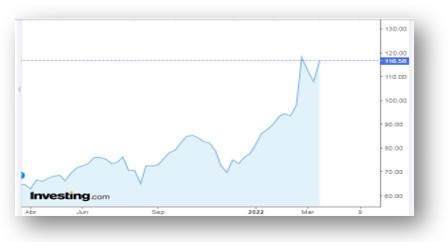 El gráfico nos muestra la suba desde abril del año pasado. Y cómo se acentúa con la invasión rusa a su país vecino.