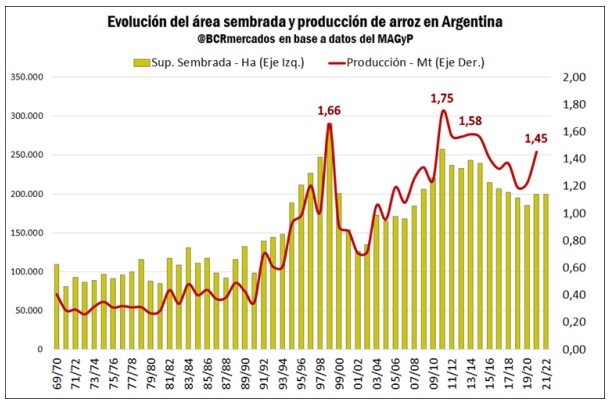 Al contemplar una perspectiva histórica del cultivo de arroz en Argentina, tras 20 años de estabilidad, en la década del noventa se registró un boom en la expansión del área sembrada arribando a un récord de 290.850 hectáreas y una producción de 1,66 millones de toneladas en el ciclo 1998/99. A partir de aquí, se observó una gran contracción del área en sintonía con la crisis económica que se desencadenó a comienzos de los años 2000.