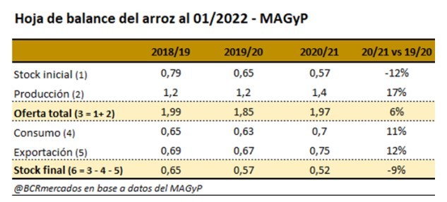 Si se analiza la situación de la hoja de balance de arroz, en las últimas tres campañas se registra una caída de los stocks finales en sintonía con la mayor demanda por consumo y exportación. De esta forma, el ciclo 2021/22 comenzaría con los menores stocks desde al menos el ciclo 2018/19. Mientras que, en base a lo comentado anteriormente aún se presenta incertidumbre respecto al volumen a producir y tonelajes factibles a exportar a pesar de que se sostuvo el área sembrada de la campaña 2020/21.
