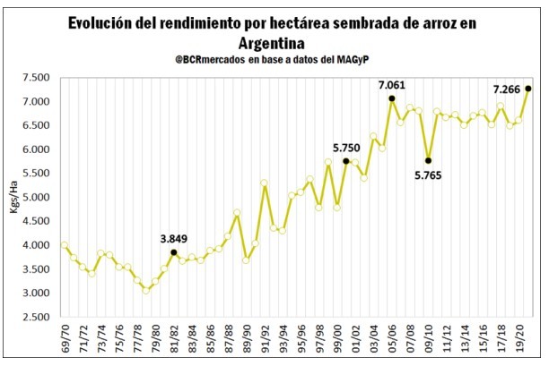 Por último, respecto a la evolución de los rendimientos promedio por hectárea a nivel nacional, el cultivo de arroz ha presentado un gran avance en materia de rindes en el último medio siglo. Desde el ciclo 1978/79 a la actual campaña 2020/21 las toneladas obtenidas por hectárea han aumentado un 138%, con el último ciclo productivo alcanzando un récord histórico en materia de productividad.