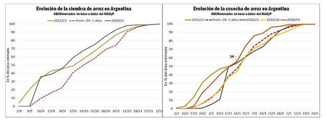 No obstante, en cuanto al estado de los cultivos, en el informe mensual de febrero de 2022 del MAGyP se reportó una pérdida de superficie en la provincia de Corrientes, debido a la intensa sequía y en menor medida a los incendios ocurridos. A su vez, en este contexto, la falta de agua ha provocado también una irrigación insuficiente, lo que devendría en una merma en el rinde final, aunque aún no se tienen estimaciones oficiales sobre la producción total.