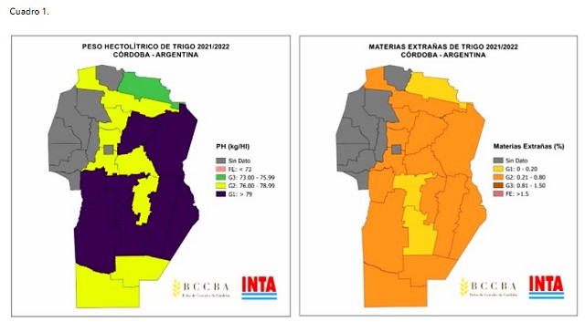 La calidad comercial se determinó, aplicando los parámetros contenidos en la resolución SAGPyA 1262/04, la que se caracterizó por tener la mayoría de los Grados resultantes condicionados por Materias Extrañas y Peso Hectolitrico. El valor de proteínas fue menor en relación a la campaña anterior. Los valores de humedad el 90% de las muestras analizadas se encontraron dentro de la tolerancia de recibo 14.0%.En la campaña de trigo 2021/22 se observaron buenos valores de Peso Hectolítrico, superiores a la campaña 2020/2021, encontrándose el 47% de los departamentos muestreados dentro del Grado 1 de comercialización con 79,78 kg/hl promedio (Juárez Celman, Marcos Juárez, Rio Cuarto, Rio Primero, San Justo, Tercero Arriba, Unión y Calamuchita, este último el de mayor valor departamental 80.76 Kg/hl).El 47% en Grado 2 con 78,29 kg/hl promedio (Colon, General Roca, Gral. San Martin, Rio Segundo, R. Sáenz Peña, Santa Maria, Totoral y Tulumba). Solo en Grado 3 se ubicó el departamento Rio Seco con 75,96 kg/hl. El conjunto general provincial presentó un valor de 79,15 kg/hl Grado 1 (Campaña 2020/21 78,39 kg/hl).
