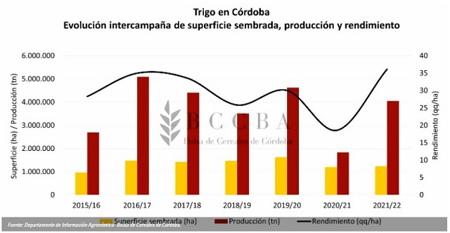 La producción de trigo de la provincia de Córdoba mostró un incremento del 120% respecto de la campaña anterior logrando 4.055.000 Tn, con un rinde promedio de 36,1 qq/ha.