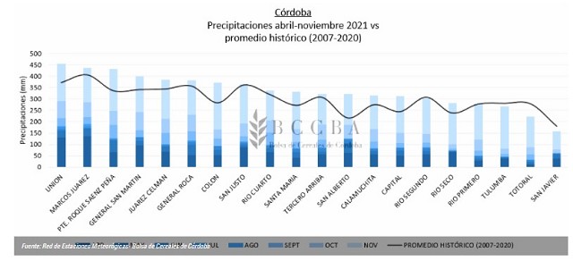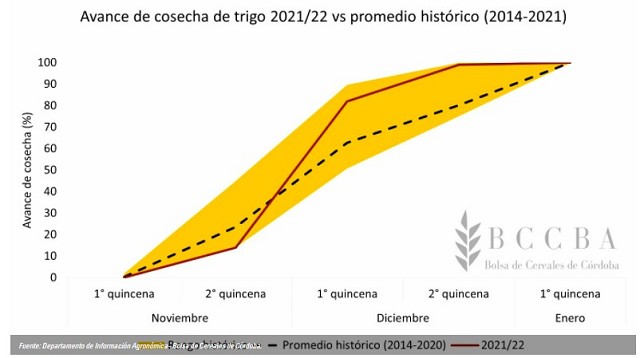 En la campaña invernal 2021/22 las lluvias fueron levemente superiores al promedio histórico en prácticamente toda la provincia, excepto en los departamentos San Javier, Tulumba y Totoral. Si bien las condiciones no fueron óptimas durante el inicio del ciclo del trigo, la resistencia del cereal durante sus primeros estadios le permitió transcurrir el invierno sin mayores inconvenientes. Posteriormente el cultivo se vio favorecido por buenas precipitaciones durante el periodo crítico, lo que le permitió obtener buenos rindes en una campaña que había comenzado con poca expectativa.