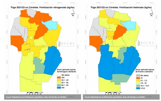 En la campaña 2021/22 el 90 % de la superficie sembrada con trigo recibió algún tipo de fertilización. La mayor parte fue fertilizada a la siembra, y en algunos casos tuvo un aporte extra durante macollaje. Por otra parte, el 12 % del área se fertilizó solo en macollaje. Los productos más utilizados fueron urea, fosfato monoamónico y fosfato diamónico.